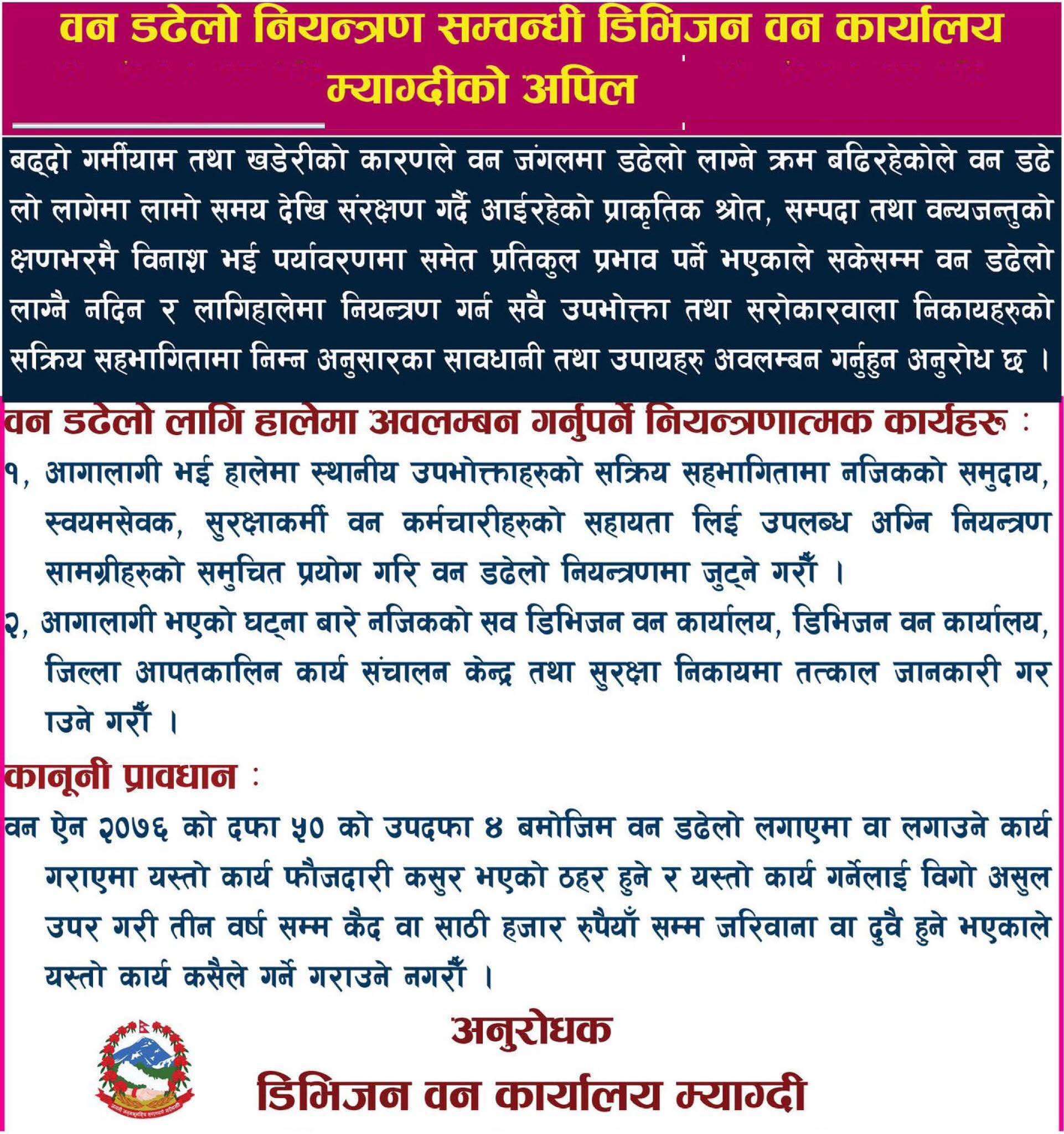म्याग्दी, ६ वैशाख । म्याग्दीको प्रदेश अस्पताल बेनीमा आपतकालीन उद्धार तथा उपचार व्यवस्थापनसम्बन्धी कृतिम अभ्यास... पुरा पढ्नुहोस