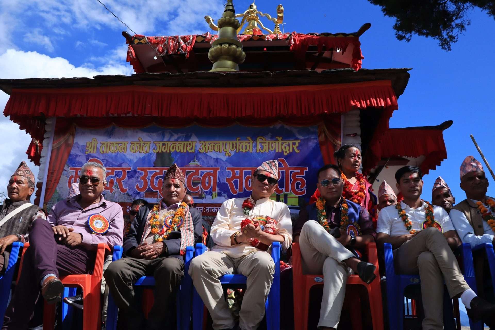म्याग्दी । रु एक करोडभन्दा बढी चन्दा सहयोग जुटाएर म्याग्दीको धौलागिरी गाउँपालिका–७ मा रहेको ताकमकोत–अन्नपूर्ण–जगन्नाथ मन्दिरको पुनर्निर्माण भएको छ । जगन्नाथ अन्नपूर्ण कोष तथा व्यवस्थापन समितिले धार्मिक र ऐतिहासिक महत्वको पर्यटकीय सम्भावनायुक्त ताकमकोतमा रहेको अन्नपूर्ण–जगन्नाथ मन्दिर पुनर्निर्माण गरेको हो । विसं १२४६ देखि १५४५ सम्म तत्कालीन थापा राजाले राज्य सञ्चालन गरेको ताकमकोतमा विसं १८८२ मा नेपाल एकीकरण हुनुअघि मल्ल राजाहरूले शाषन गरेका थिए । सोह्रौँ शताब्दीमा निर्माण भएको ताकमकोत–अन्नपूर्ण– जगन्नाथ मन्दिर विसं १९९० र २०७२ को भूकम्पले जीर्ण बनेपछि समुदायस्तरबाट आर्थिक सहयोग जुटाएर विसं २०७५ देखि पुनर्निर्माण थालिएको थियो । मन्दिर पुनर्निर्माण समितिका अध्यक्ष तेजेन्द्र थापाले पुनर्निर्माणमा रु एक करोड १९ लाख ३१ हजार ८३३ खर्च भएको जानकारी दिए । रु एक करोड १४ लाख पाँच हजार १३८ चन्दा सङ्कलन भएको र रु पाँच लाख २६ हजार ६९५ अपुग भएको थापाले बताए । पुरातत्व विभागको रु ५० लाख बजेटबाट ठेक्कामार्फत रामसिताको मन्दिर निर्माण भएको छ । धवलागिरी गाउँपालिकाको रु तीन लाख ५० हजार बजेट र हाल अमेरिकामा रहनुभएका रघुनाथ सुवेदीको अगुवाइमा दाताको रु २४ लाख ४० हजार सहयोगमा १२ फिट अग्लो हनुमानको मूर्ति राखिएको वडाध्यक्ष अशोक खत्रीले बताए । गण्डकी प्रदेश सरकार र सहरी विकास मन्त्रालयको बजेटबाट सडकदेखि कोत परिसर पुग्ने पक्की पदमार्ग निर्माण भएको छ । गाउँपालिकाको सहयोगमा सत्तल र सार्वजनिक शौचालय निर्माण भएको छ । म्याग्दीको प्रमुख शक्तिपीठ मानिने ताकमकोतको जगन्नाथ अन्नपूर्ण मन्दिरमा पूजाआजा र भाकल गरेमा मनोकांक्षा पूरा हुने जनविश्वास रहेको मन्दिर व्यवस्थापन समितिका अध्यक्ष कलानिधि शर्माले बताए । जगन्नाथ, अन्नपूर्ण, दुर्गालगायत देवी–देवताको मूर्ति रहेका यहाँ नवदुर्गा, जेष्ठी पूर्णिमा, मङ्सिर पूर्णिमा, चैत्राष्टमी पर्वका अवसरमा विशेष मेला लाग्ने गर्छ ।तत्कालीन राजाले कोतघरको रूपमा समेत प्रयोग भएको उक्त मन्दिरमा ऐतिहासिक महत्वका तोप, तरबार, खुँडा, खुकुरी, ढाललगायतका हातहतियार छन् । समुद्री सतहबाट दुई हजार ५०० मिटरको उचाइमा अवस्थित ताकमकोतबाट गुर्जा, धवलागिरि, नीलगिरि, अन्नपूर्ण र माछापुच्छे शृङ्खलाका साथै मनोरम पहाडी भूगोल, ग्रामीण बस्ती र सूर्योदयको दृष्यावलोकन गर्न सकिन्छ । धौलागिरि गाउँपालिकाका अध्यक्ष प्रेमप्रसाद पुनले मन्दिर पुनर्निर्माण र थप पूर्वाधार विस्तारसँगै ताकमकोत पर्यटकीयस्थलको रुपमा विकास भएको बताए । ताकमकोतको विकास र प्रवद्र्धनका कार्यक्रमलाई निरन्तरता दिने उनले प्रतिबद्धता जनाए ।