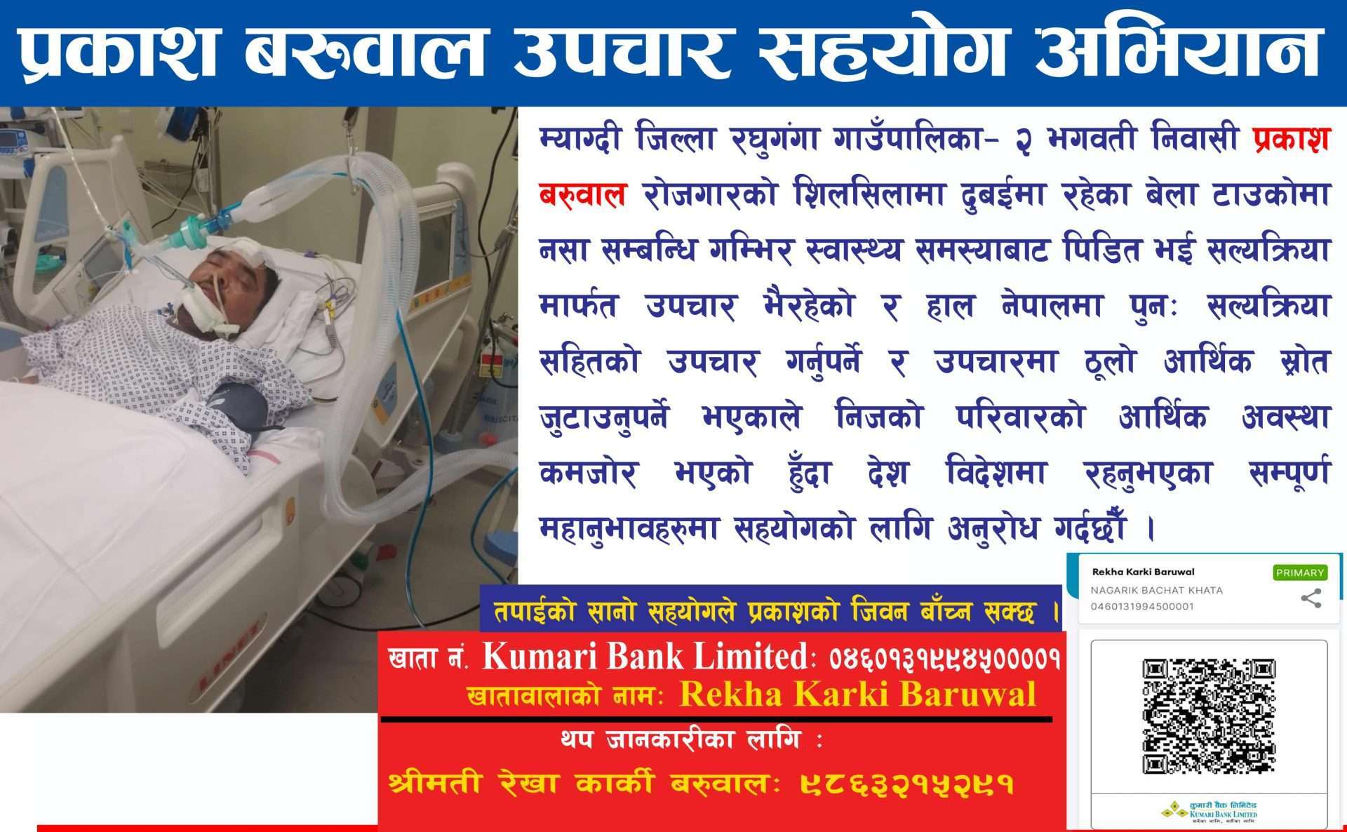 टाउकोमा गम्भिर स्वास्थ्य समस्याबाट पीडित हुनुभएका म्याग्दीको रघुगंगा गाउँपालिका– २ भगवती, घट्ट निवासी ३४ बर्षिय प्रकाश बरुवालको उपचारमा अष्ट्रेलियामा रहेका राखुबासीले करिब रु ३ लाख सहयोग गरेका छन् । टाउकोमा नसा सम्बन्धि गम्भिर स्वास्थ्य समस्याबाट पिडित भई सल्यक्रिया मार्फत उपचार गराइरहनुभएका बरुवालको उपचारमा राखु समाज अष्टे«लियाको पहलमा रु २ लाख ९१ हजार २७५ संकलन गरिएको हो ।