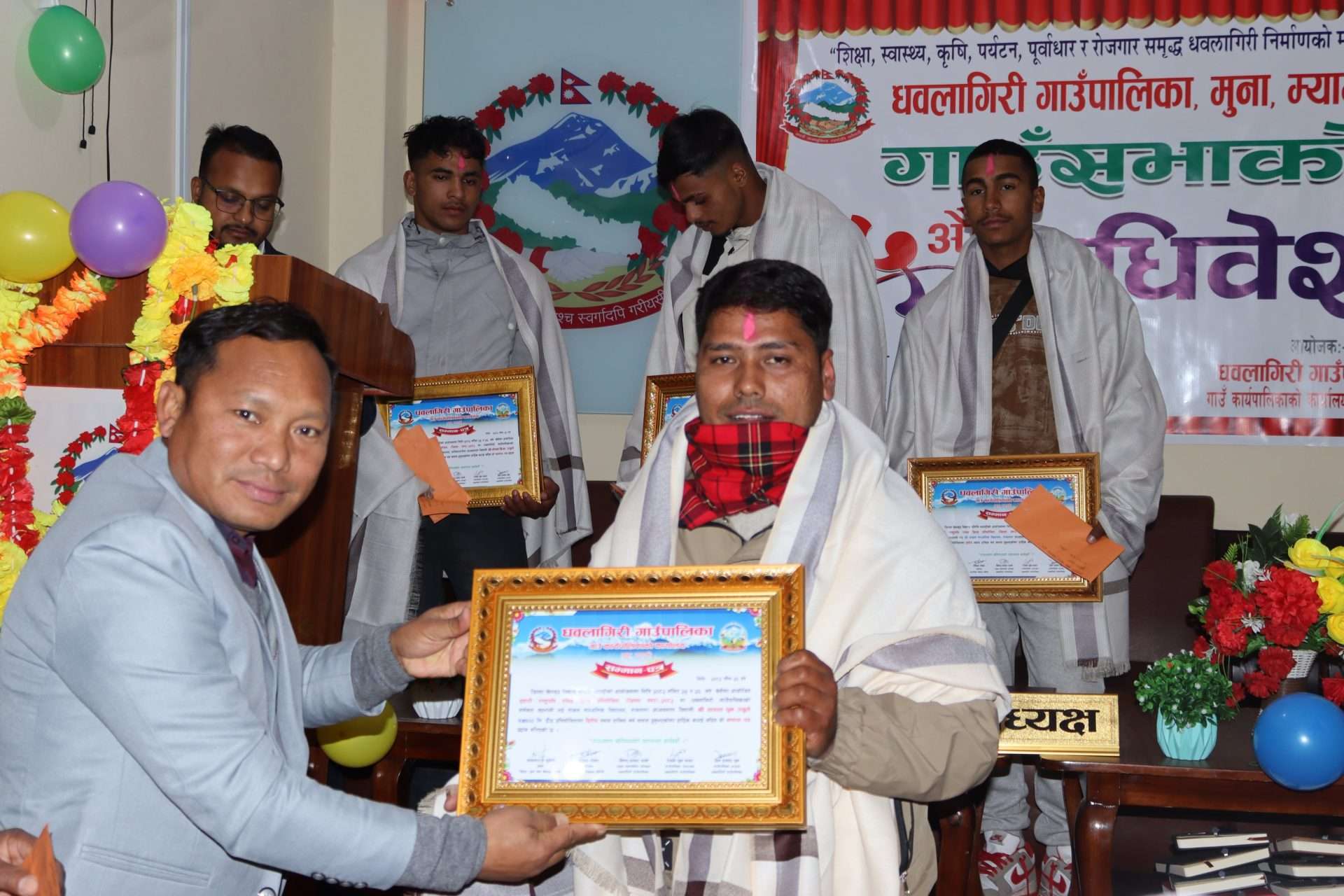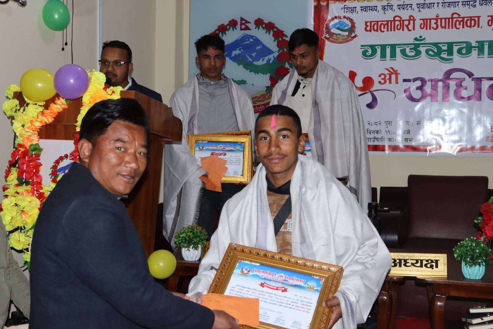 हाल अस्टे«लीयामा रहेका गाउँपालिकाका पुर्वकर्मचारी आश्विन खत्रीले संकलन गरेर पठाएको रु. ५५ हजार खेलाडीहरुलाई पुरस्कार वितरण गरिएको हो । ११ औ जिल्ला स्तरीय राष्ट्रपति रनिङ्ग शिल्डमा धवलागिरीले एक स्वर्ण, दुई रजत र पाँच कास्य पदक जितेको थियो । सभामा हालसम्म कुल बजेटको १८ प्रतिशत खर्च र लक्ष्यको ७३ प्रतिशत राजस्व संकलन भएको प्रगति विवरण जानकारी गराइएको थियो ।