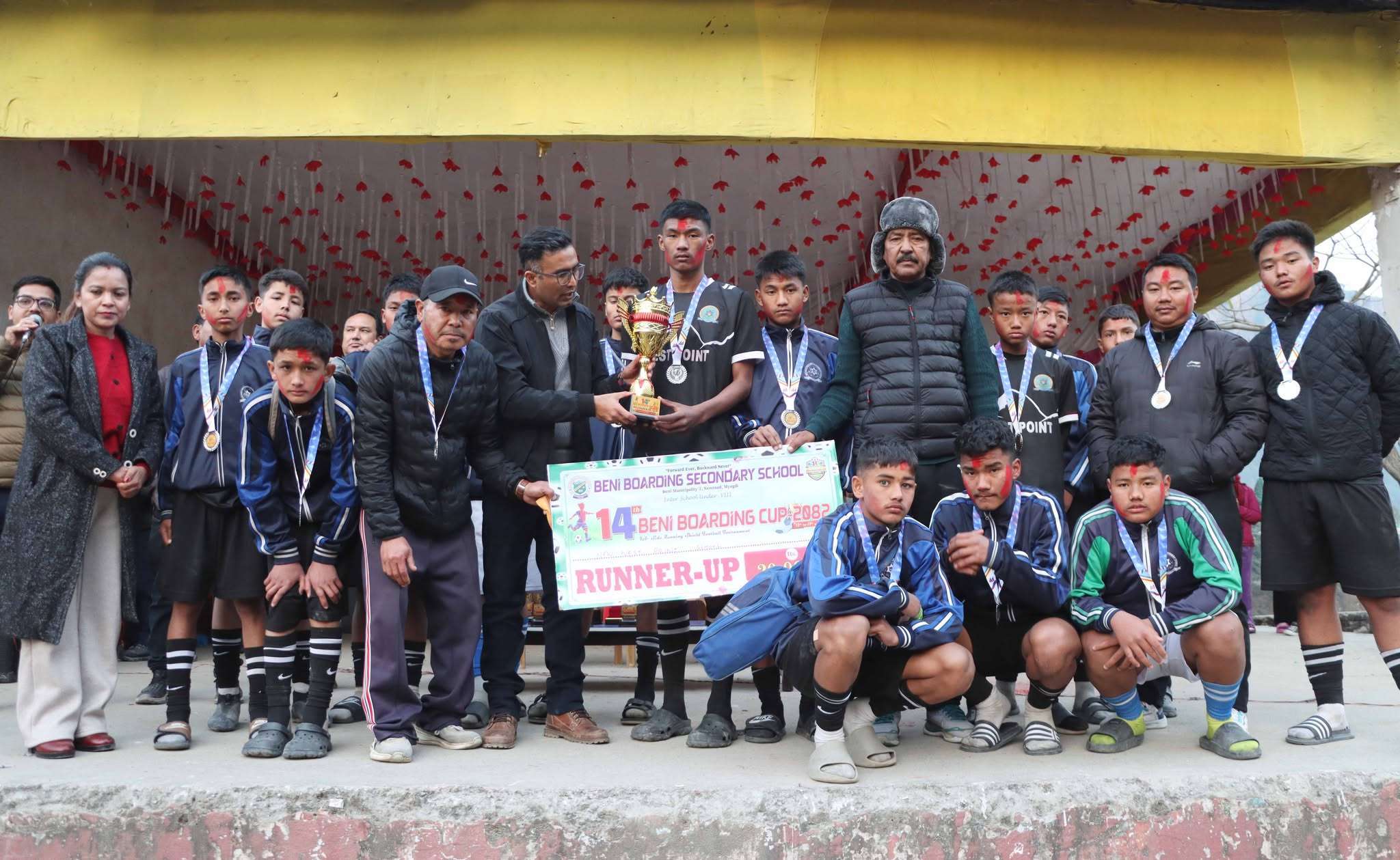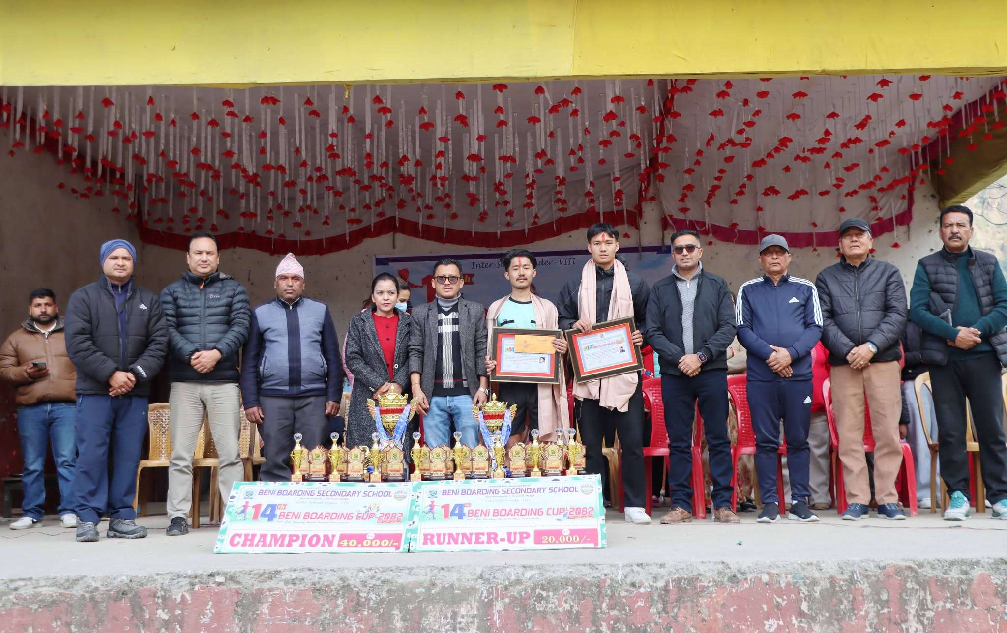 बेनी, १७ माघ । म्याग्दीको सदरमुकाम बेनीमा अवस्थित बेनी बोर्डिङ सेकेण्डरी स्कुलको आयोजनामा सम्पन्न १४औँ अन्तर–आधारभूत तह बेनी बोर्डिङ कप फुटबल प्रतियोगिताको उपाधि बेनी सामुदायिक माध्यमिक विद्यालयले जितेको छ । शनिबार बेनी खुल्लामञ्चमा सम्पन्न फाइनल खेलमा बेनी सामुदायिक माविले न्यु वेष्ट पाेइन्ट आवासीय माविलाई १–० गोल अन्तरले पराजित गर्दै उपाधि आफ्नो पोल्टामा पारेको हो ।